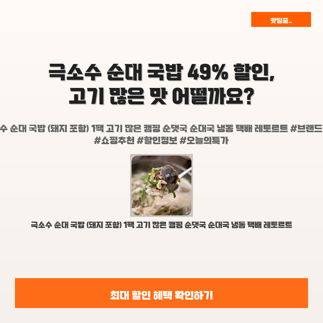 🛍️ 이 포스팅은 네이버 쇼핑 커넥트 활동의 일환으로,판매 발생 시 수수료를 제공받습니다.오늘 소개할 제품은 단연코,바로 극소수 순대 국밥입니다!요즘 캠핑이나 야외 활동이 인기를 끌고 있죠? 그럴 때 따뜻하고 든든한 한 끼가 필요할 텐데, 이 제품보다 더 좋은 선택은 없을 거예요."극소수 순대 국밥 (돼지 포함) 1팩"은 그야말로 고기 많은 맛의 진수죠!더군다나 지금 49% 할인된 가격으로 만나볼 수 있으니 더욱 매력적이지 않나요? 정말 대박 기회에요!이 국밥 한 그릇으로 행복과 만족을 동시에 느껴보세요. 여러분들도 이 특별한 맛을 꼭 경험해보셨으면 좋겠어요!게다가 고기량도 풍부해서 맛의 깊이가 남다른 이 국밥, 지금 주문해보세요!극소수 순대 국밥가 여러분의 캠핑을 더 특별하고 맛있게 만들어줄 거예요!..