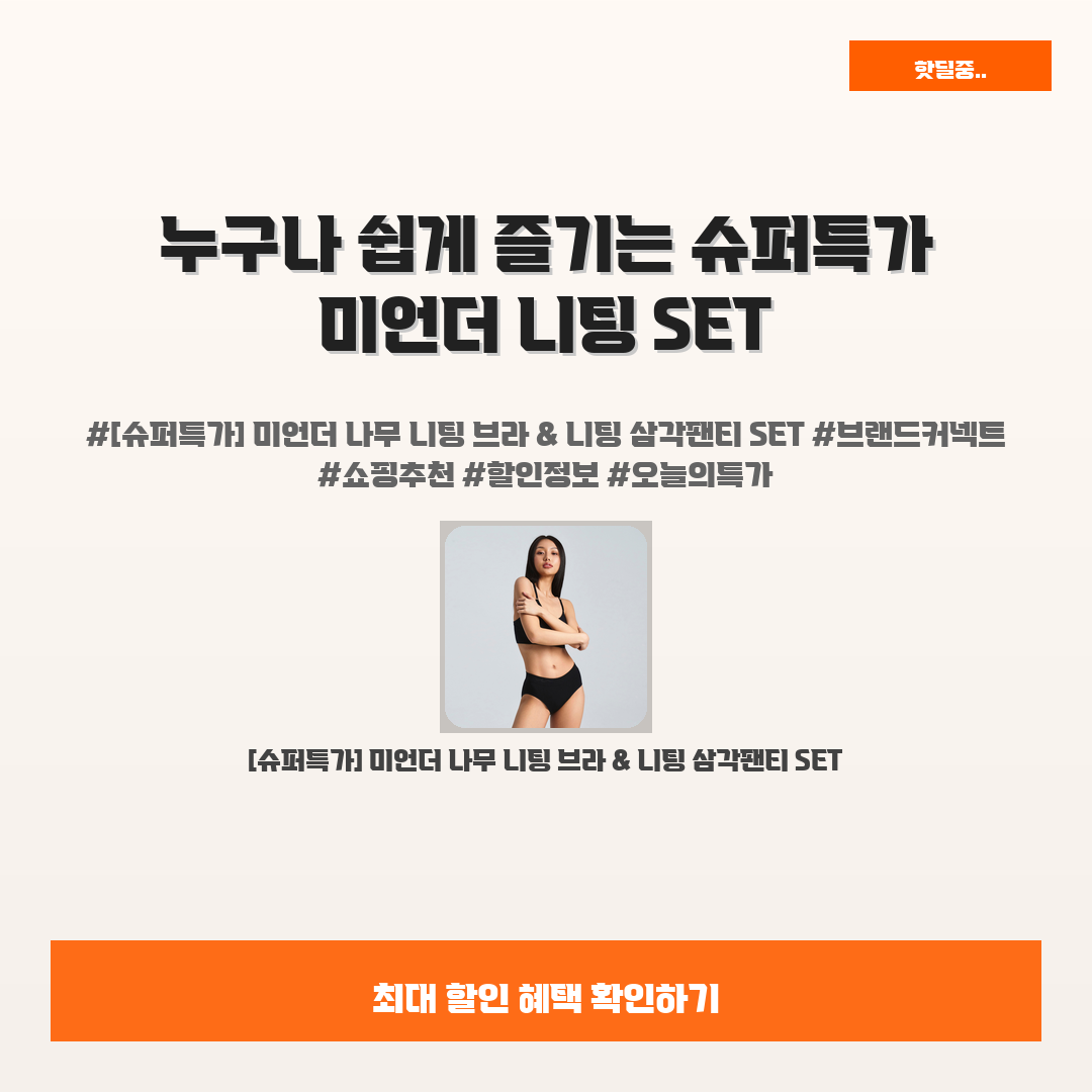 🛍️ 이 포스팅은 네이버 쇼핑 커넥트 활동의 일환으로,판매 발생 시 수수료를 제공받습니다.오늘 소개할 제품은 단연코!!!그야말로 완벽한, 갓벽한, 최고의 선택이랍니다!여러분, 요즘 가성비 좋은 언더웨어를 찾고 계신다면?"([슈퍼특가] 미언더 나무 니팅 브라 & 니팅 삼각팬티 SET)"을 소개할게요!이 제품은 정말 정말 매력적이에요! 착용감과 디자인 모두 뛰어나서 여러분도 반할 거예요.^_^아쉬운 점이 없다면 만원 단위로 할인된 가격으로 만나볼 수 있는 점도 놓치지 마세요!정말 만족스러운 쇼핑이 될 거라고 보장해요! 할인율도 빠지지 않고 확인해보세요. 후기들도 다들 극찬이니까요!※ 이거 진짜 제가 직접 써보고 쓰는 리뷰예요 광고 아님!![슈퍼특가] 미언더 나무 니팅 브라 & 니팅 삼각팬티 SET10% 4..