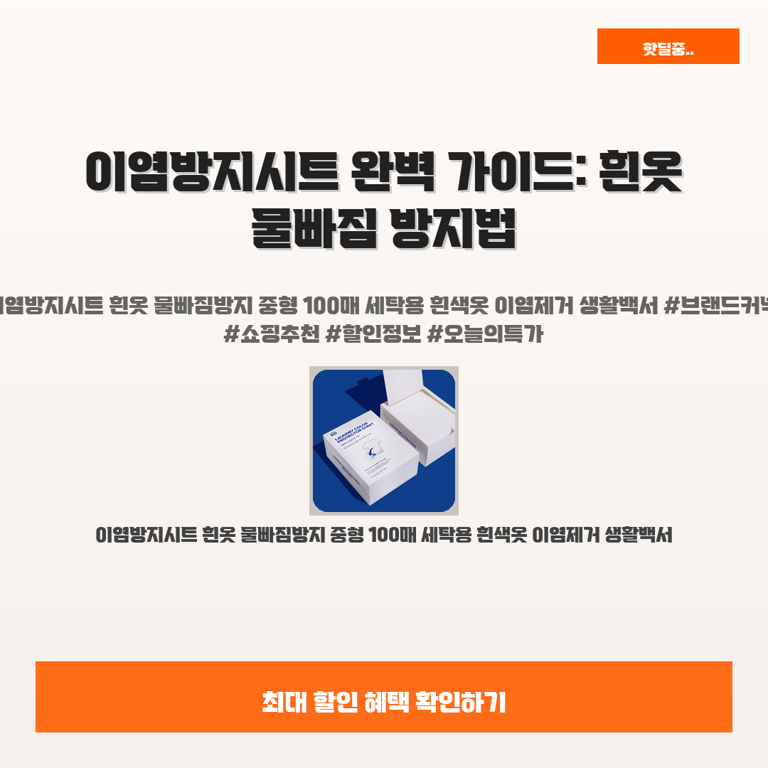 🛍️ 이 포스팅은 네이버 쇼핑 커넥트 활동의 일환으로,판매 발생 시 수수료를 제공받습니다.이염방지시트 완벽 가이드!이제 흰옷의 물빠짐, 걱정 없도록 도와줄 제품을 소개할게요.가격 불문하고 소중한 흰옷의 이염 걱정에 시달리는 분들 많으시죠?"이염방지시트 흰옷 물빠짐방지 중형 100매"로 그런 걱정을 날려보세요!저도 처음엔 의심했지만, 이젠 삶의 필수 아이템이 되었답니다.흰옷이 부담스럽지 않고, 친구들과의 소중한 시간도 더욱 즐겁게 만들어 줄 아이템에요!이건 진짜 ‘게임 체인저’라구요!50% 할인으로 만나는 수납도 간편한 흰색 옷 이염 제거의 생활 백서, 지금 꼭 확인해보세요!※ 이거 진짜 제가 직접 써보고 쓰는 리뷰예요 광고 아님!!이염방지시트 흰옷 물빠짐방지 중형 100매 세탁용 흰색옷 이염제거 생활백..