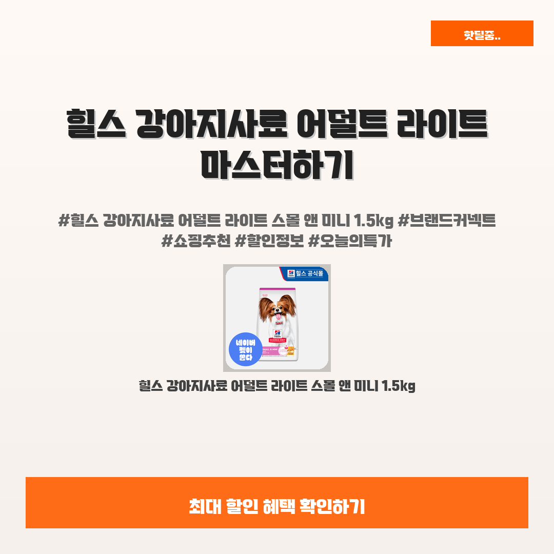 🛍️ 이 포스팅은 네이버 쇼핑 커넥트 활동의 일환으로,판매 발생 시 수수료를 제공받습니다.오늘 소개할 제품은 단언컨데,,바로 힐스 강아지사료 어덜트 라이트 스몰 앤 미니 1.5kg입니다!요즘 반려견의 체중 관리가 걱정이신가요? "힐스 강아지사료 어덜트 라이트 스몰 앤 미니 1.5kg"는 그 고민을 한 방에 해결해 줄 수 있는 솔루션입니다.이 제품은 맛도 좋고, 영양도 챙길 수 있어 반려견의 행복한 삶을 지원해 줘요!사료 선택이 어려운 반려인이라면, 꼭 한 번 경험해 보셔야 할 아이템이랍니다.더구나, 현재 15% 할인된 가격으로 제공되고 있어요! 최고의 가성비와 품질로 반려견과 함께 행복한 시간을 만들어 보세요!※ 이거 진짜 제가 직접 써보고 쓰는 리뷰예요 광고 아님!!힐스 강아지사료 어덜트 라이트 스몰..