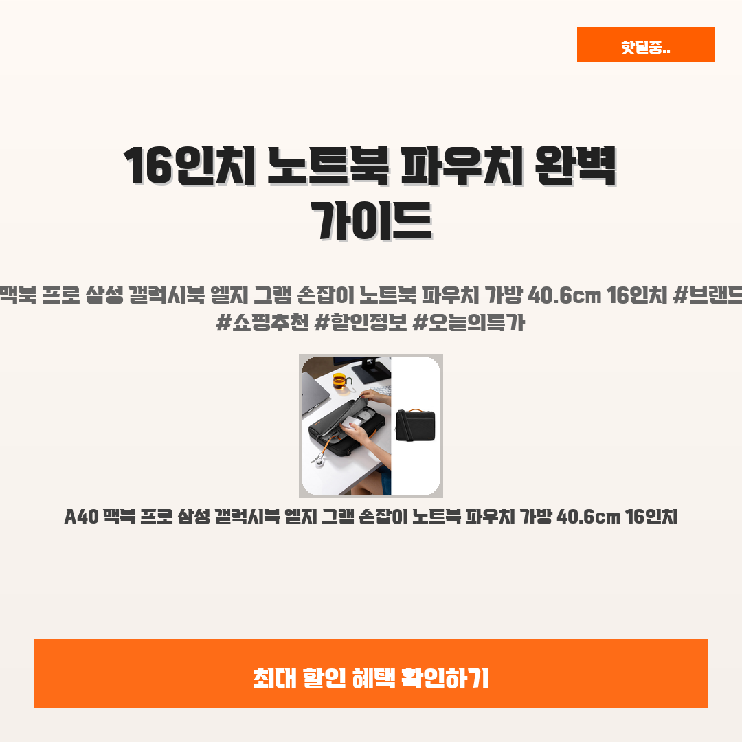 🛍️ 이 포스팅은 네이버 쇼핑 커넥트 활동의 일환으로,판매 발생 시 수수료를 제공받습니다.오늘 소개할 제품은 단언컨데,,A40 맥북 프로 삼성 갤럭시북 엘지 그램 손잡이 노트북 파우치 가방 40.6cm 16인치 입니다!여러분, 요즘 노트북을 들고 다닐 때의 불편함 느껴보셨나요?소중한 기기를 보호하면서도 스타일을 잃지 않는 방법이 필요하다면, A40 노트북 파우치가 답이에요!이 파우치는 모든 16인치 노트북에 적합하고, 편리한 손잡이로 휴대가 간편하답니다.매일 바쁜 일상 속에서 이 제품이 여러분의 노트북을 안전하게 지켜줄 거라 믿어요.게다가, 가성비도 뛰어나 가방 하나로 고급스러움을 느낄 수 있습니다.이제는 노트북을 보다 안전하고 스타일리시하게 사용할 수 있는 기회를 놓치지 마세요!※ 이거 진짜 제가 직..