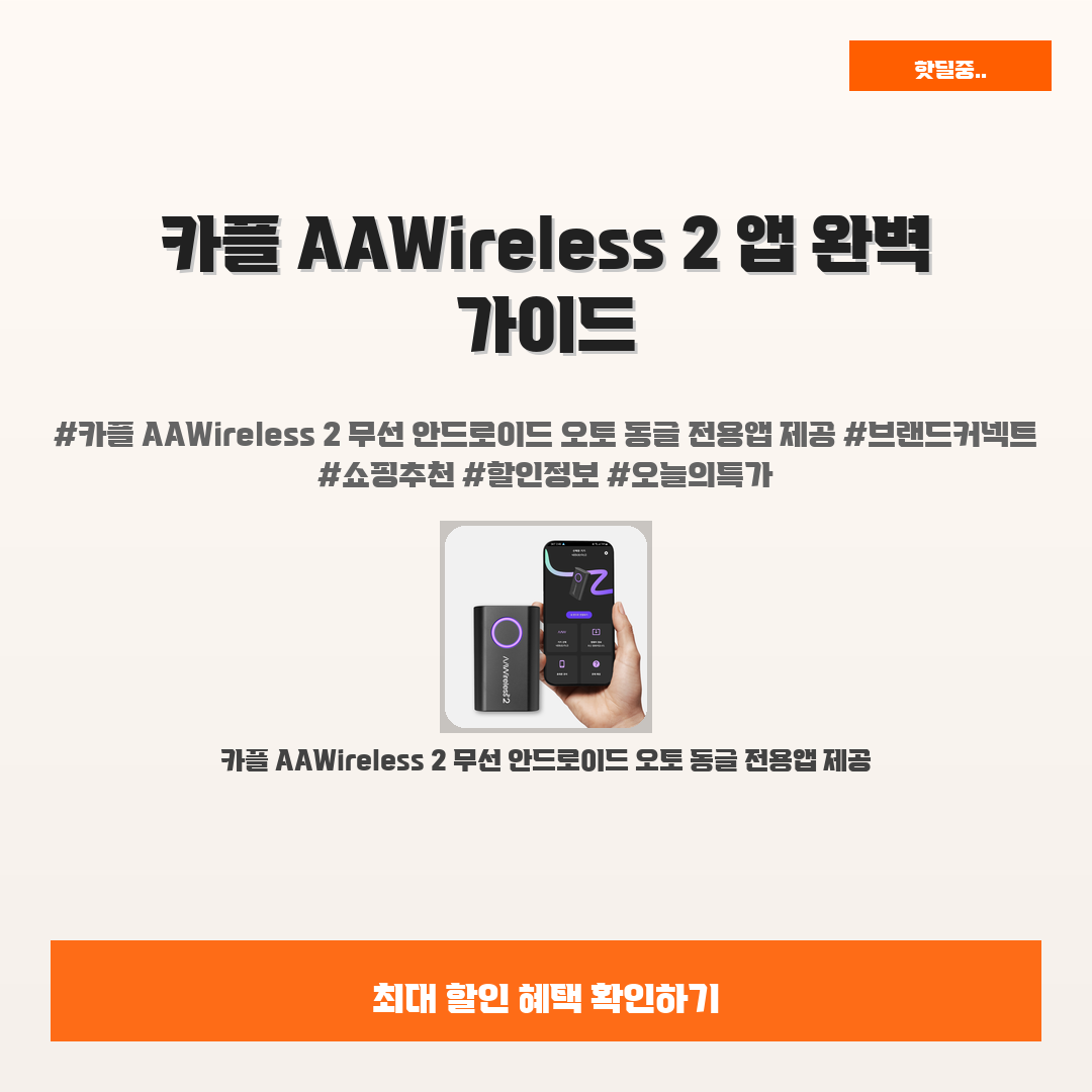 🛍️ 이 포스팅은 네이버 쇼핑 커넥트 활동의 일환으로,판매 발생 시 수수료를 제공받습니다.오늘 소개할 제품은 단언컨데,,그야말로 완벽한, 갓벽한, 감동적인 제품이라구요저도 요즘 완전 빠진 제품이 있거든요? 바로 "카플 AAWireless 2 무선 안드로이드 오토 동글 전용앱 제공"예요! 이 동글 하나로 차량에서 안드로이드 오토를 무선으로 사용하면서 진정한 편리함을 경험할 수 있답니다."차에서 스마트폰을 무선으로 어떻게 연결하지?"라는 고민이 있으신가요? 카플 AAWireless 2가 그런 문제를 완벽하게 해결해줄 거예요! 이 제품 덕분에 끊김 없는 음악 스트리밍과 간편한 네비게이션이 가능해져서, 그 기분은 정말 최고랍니다.게다가 가성비가 미쳤어요. 정가는 199,000원이지만 현재 84,900원에 만나..