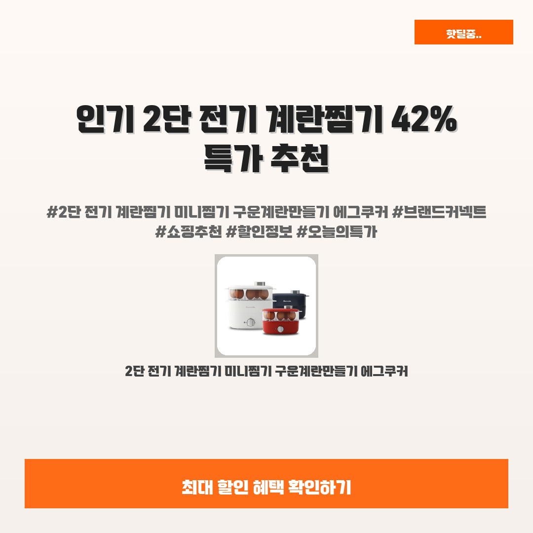🛍️ 이 포스팅은 네이버 쇼핑 커넥트 활동의 일환으로,판매 발생 시 수수료를 제공받습니다.오늘 소개할 제품은 단연코,,그야말로 완벽한, 갓벽한, 감동적인 아이템이에요!요즘 많은 분들이 살찌지 않고 건강하게 간편하게 조리할 방법을 찾고 계실 텐데요,이럴 때 필요한 바로 "2단 전기 계란찜기 미니찜기 구운계란만들기 에그쿠커"랍니다.실제로 사용해보면 느끼는 그 효율성과 간편함, 정말 놀라워요! 이제 아침식사 준비가 그렇게 쉽다니 믿기 힘들 정도예요.여러분도 이 편리함을 직접 느껴보셨으면 좋겠어요!가격도 정말 착해요! 원가 69,900원에서 지금 42% 할인된 39,900원으로 제공되고 있거든요.이 기회를 절대 놓치지 마세요! 저도 사용 후 너무 만족해서 주변에 자랑하고 다니는 중이에요.※ 이거 진짜 제가 직..