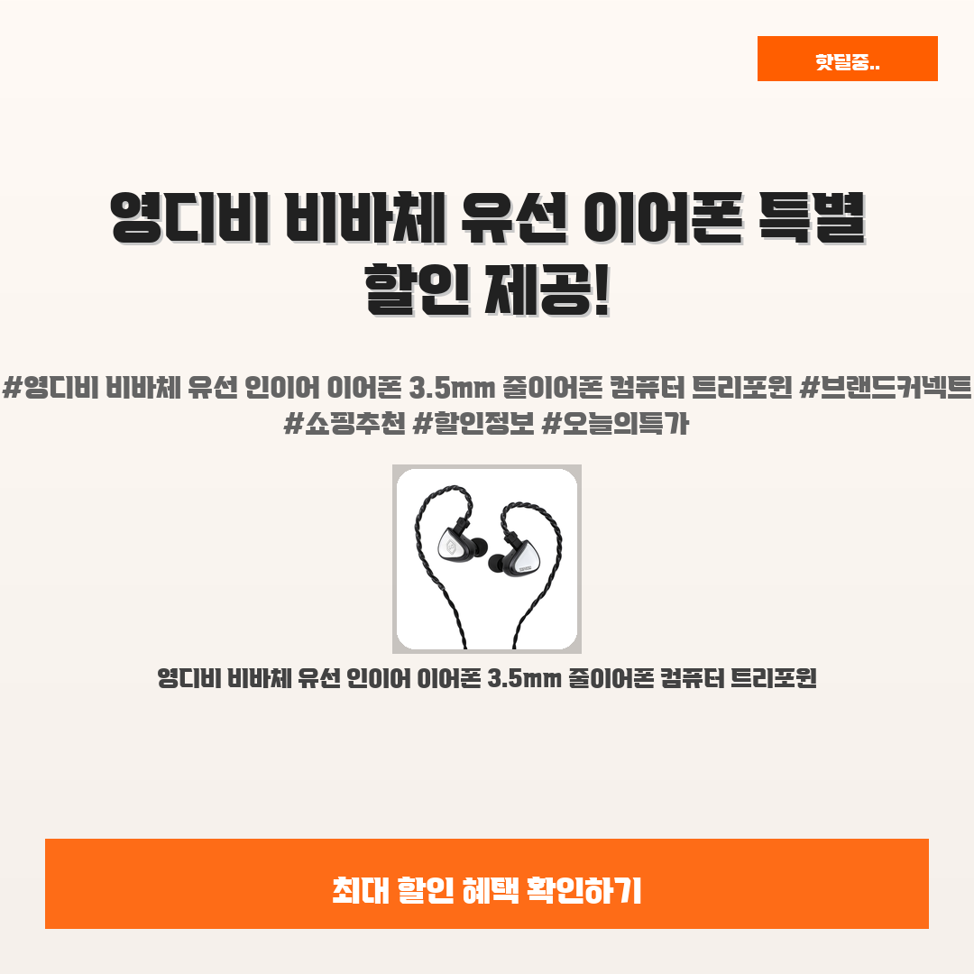 🛍️ 이 포스팅은 네이버 쇼핑 커넥트 활동의 일환으로,판매 발생 시 수수료를 제공받습니다.오늘 소개할 제품은 단언컨데,,바로 영디비 비바체 유선 인이어 이어폰 3.5mm 줄이어폰 컴퓨터 트리포윈입니다!요즘 많은 분들이 음질 좋고 착용감 편안한 이어폰을 찾고 계시죠?영디비 비바체 유선 이어폰은 특히 작업이나 게임할 때 필수 아이템으로 자리 잡았어요.이 이어폰은 정말 사용해보면 행복감이 느껴질 만큼 음질이 뛰어나요!여러분의 소중한 시간을 더욱 가치 있게 만들어줄 거예요.지금 특별 할인가로 만날 수 있는 절호의 찬스! 진정한 가성비를 찾고 계셨다면, 영디비 비바체 유선 인이어 이어폰을 추천합니다!※ 이거 진짜 제가 직접 써보고 쓰는 리뷰예요 광고 아님!!영디비 비바체 유선 인이어 이어폰 3.5mm 줄이어폰 ..