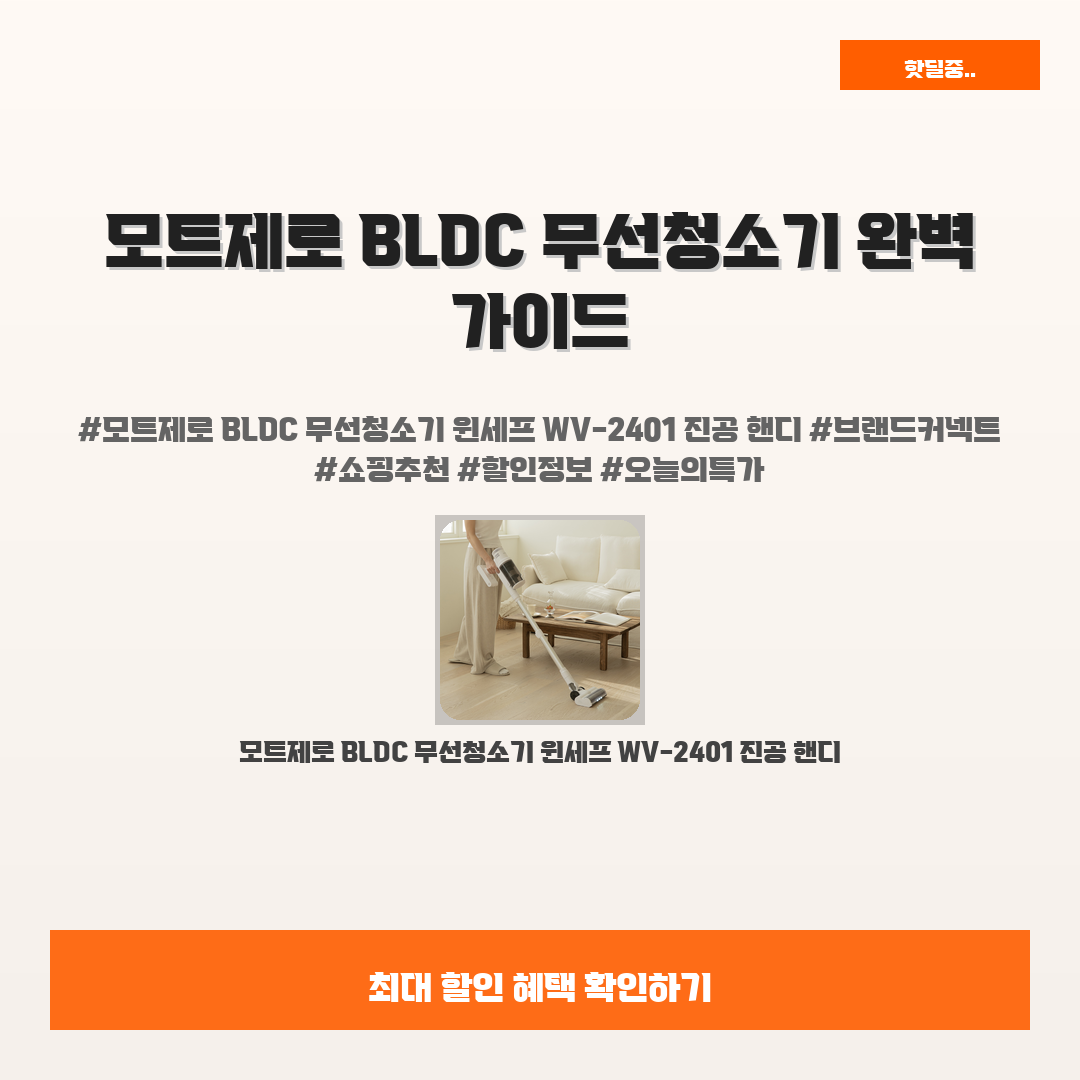 🛍️ 이 포스팅은 네이버 쇼핑 커넥트 활동의 일환으로,판매 발생 시 수수료를 제공받습니다.여러분, 오늘 만날 제품은바로 모트제로 BLDC 무선청소기 윈세프 WV-2401 진공 핸디입니다!매일 쌓이는 먼지와 오염물질로 고민이신가요? 특히 바쁜 일상 속에서 청소할 시간이 부족한 여러분에게는 더 큰 문제일 텐데요,이 제품이 여러분의 일상을 얼마나 변화시킬지 상상해 보셨나요?모트제로 BLDC 무선청소기는 그런 고민을 완벽히 해결해줄 수 있는 혁신적인 선택입니다!성능과 디자인 모두를 갖춘 이 청소기는 정말 높은 만족감을 줄 거예요. 저처럼 매일 청소의 기쁨을 느끼는 건 어떠세요?요즘 할인율 31%로 판매 중이라서 가성비 역시 대박입니다!리뷰도 이미 극찬이 끊이지 않는 이 제품, 놓치지 마세요!※ 이거 진짜 제가..