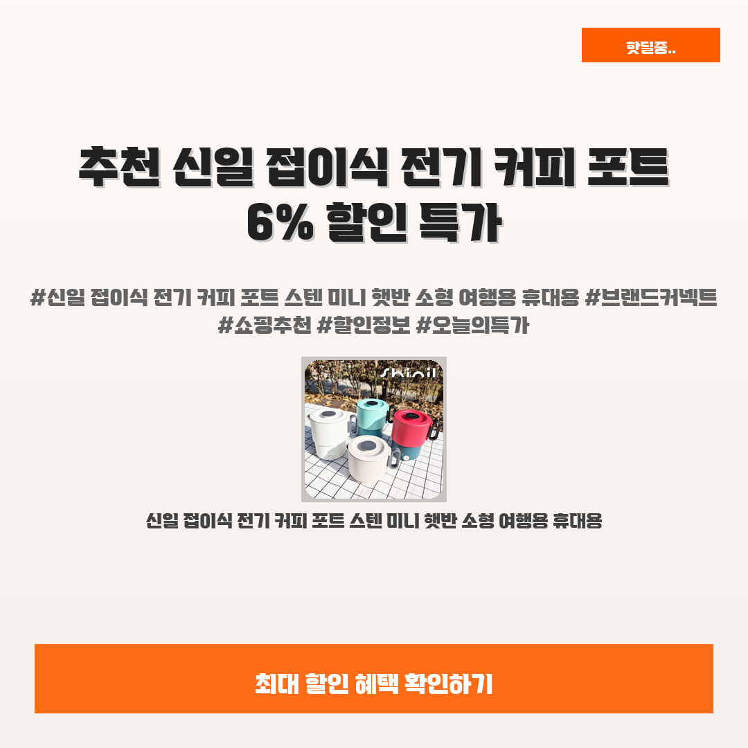 🛍️ 이 포스팅은 네이버 쇼핑 커넥트 활동의 일환으로,판매 발생 시 수수료를 제공받습니다.오늘 소개할 제품은 정말 대박이에요!바로 신일 접이식 전기 커피 포트 스텐 미니 햇반 소형 여행용 휴대용입니다!여행을 떠날 때 맛있는 커피 한 잔의 여유를 포기하고 싶지 않으신가요? 점점 더 바쁜 일상 속에서 간편하게 커피를 즐기고 싶다면, 이 신일 접이식 전기 커피 포트가 해결책이 될 거예요!이 포트는 소형이지만 성능은 절대 후지지 않아요! 친구와의 캠핑이나 출장에서도 완벽한 동반자가 되어줄 거랍니다. 많은 분들이 선택한 이 제품의 인기도, 후기도 환상적이에요. 여러분도 이제 커피를 더 쉽게 즐길 수 있는 기회를 놓치지 마세요!그리고 지금은 무려 6% 할인! 가성비까지 미친 이 기회를 놓치지 마세요. 신일 접이식..