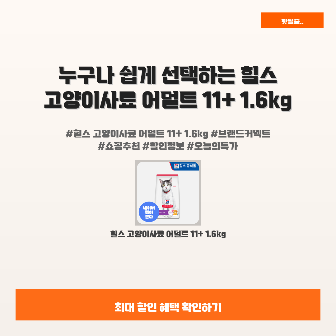 🛍️ 이 포스팅은 네이버 쇼핑 커넥트 활동의 일환으로,판매 발생 시 수수료를 제공받습니다.오늘 소개할 제품은 단연코,,바로 힐스 고양이사료 어덜트 11+ 1.6kg 입니다!고양이의 건강과 행복을 가장 중요하게 생각하는 여러분!믿을 수 있는 사료를 찾고 계신가요? 그럼 이 제품이 바로 당신의 선택이 될 거예요!애완동물은 소중한 가족이니까요. 하지만 어떤 사료를 줘야 할지 고민되시는 분들이 많으실 겁니다.걱정 마세요! 힐스 고양이사료 어덜트 11+ 1.6kg가 여러분의 고민을 해결해줄거예요.이 사료는 뛰어난 영양 성분과 맛을 자랑해요. 저렴한 가격에 고품질 영양소를 제공하니,여러분의 소중한 고양이도 만족할 거라 장담합니다! 지금 바로 확인해 보세요!※ 이거 진짜 제가 직접 써보고 쓰는 리뷰예요 광고 아님!..