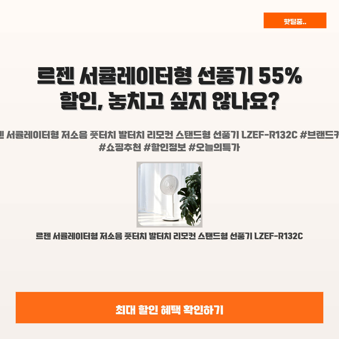 🛍️ 이 포스팅은 네이버 쇼핑 커넥트 활동의 일환으로,판매 발생 시 수수료를 제공받습니다.오늘 소개할 제품은 단언컨데,,그야말로 완벽한, 갓벽한, 감동적인 제품이라구요요즘 같은 무더위에 더위를 피할 완벽한 방법이 필요하시죠? 바로 "르젠 서큘레이터형 저소음 풋터치 발터치 리모컨 스탠드형 선풍기 LZEF-R132C" 이라는 제품이에요!저소음 기능 덕분에 편안한 수면을 도와주고, 리모컨으로 손쉽게 조작할 수 있어 정말 편리해요. 최근에 친구에게 선물했는데, “이거 대박이야!” 하면서 너무 좋아했어요게다가 현재 55% 할인으로 가성비도 갑이에요! 단 39,800원에 이 모든 것을 누릴 수 있다니, 고민할 필요가 없어요! 꼭 고려해보세요~※ 이거 진짜 제가 직접 써보고 쓰는 리뷰예요 광고 아님!!르젠 서큘레이..