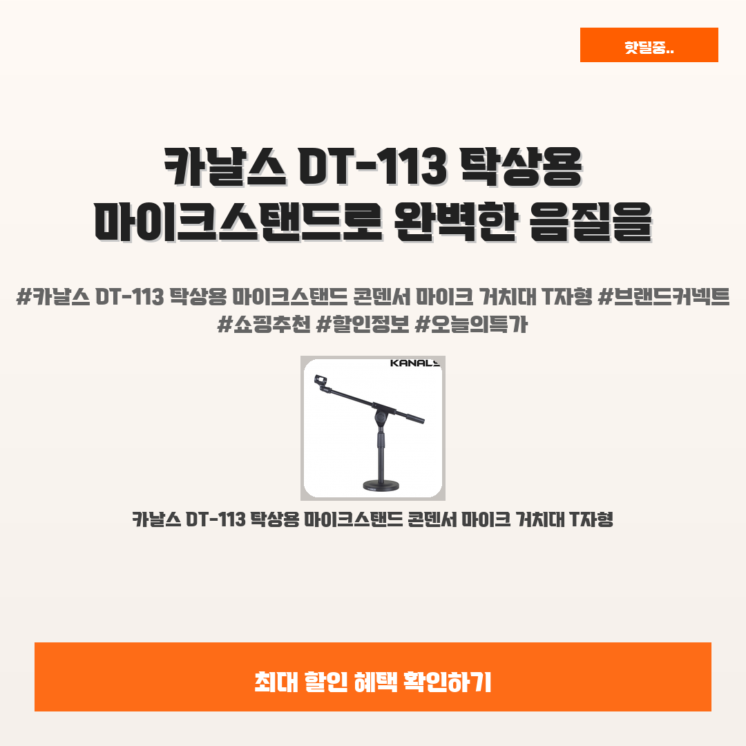 🛍️ 이 포스팅은 네이버 쇼핑 커넥트 활동의 일환으로,판매 발생 시 수수료를 제공받습니다.오늘 소개할 제품은 단언컨데,,그야말로 완벽한 음질을 위해 태어난 카날스 DT-113 탁상용 마이크스탠드입니다!여러분, 방송이나 녹음을 할 때 음질 걱정 한 번쯤 해보셨죠? 그런데 이 마이크스탠드는 그 걱정을 단번에 날려줄 완벽한 해결책이에요!제가 이 카날스 DT-113 탁상용 마이크스탠드를 사용한 이후로 음질이 룩과 소리의 퀄리티가 확실히 뛰어나다는 것을 느꼈어요. 많은 분들이 이 제품을 찬양하는 이유가 분명히 있더라구요!놀라운 건 가성비까지 훌륭하다는 점이에요. 정가 58,000원에서 할인된 가격인 56,840원은 정말 매력적이죠. 마이크를 만나는 새로운 방법, 지금 확인해보세요!※ 이거 진짜 제가 직접 써보고..